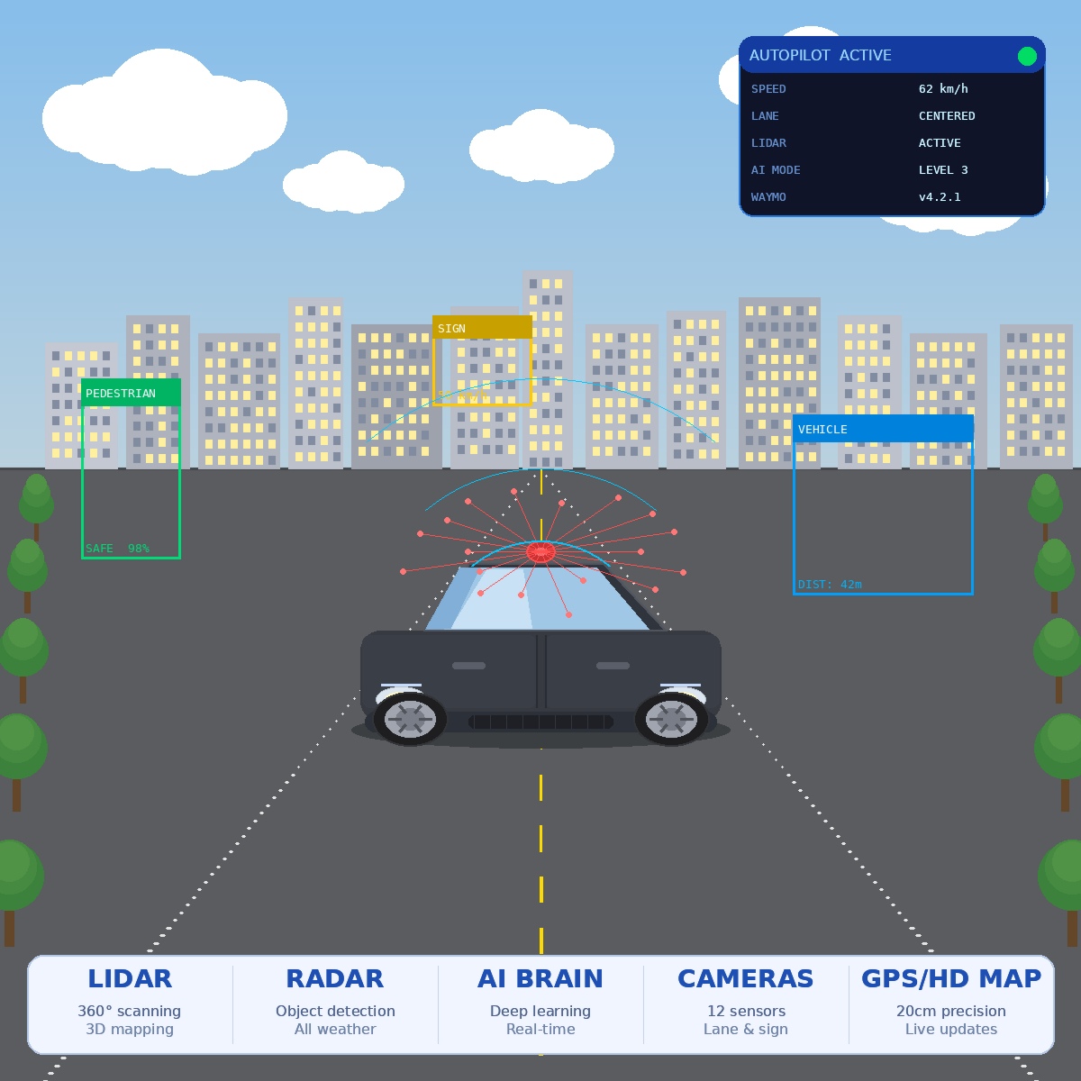 LiDAR — Light Detection and Ranging — fires laser pulses in every direction and measures how long they take to bounce back. This builds a real-time 3D map of everything within roughly 200 metres of the vehicle: other cars, cyclists, pedestrians, road barriers, even fallen branches. Waymo’s latest vehicles use multiple LiDAR units that together scan the full 360-degree environment hundreds of times per second.